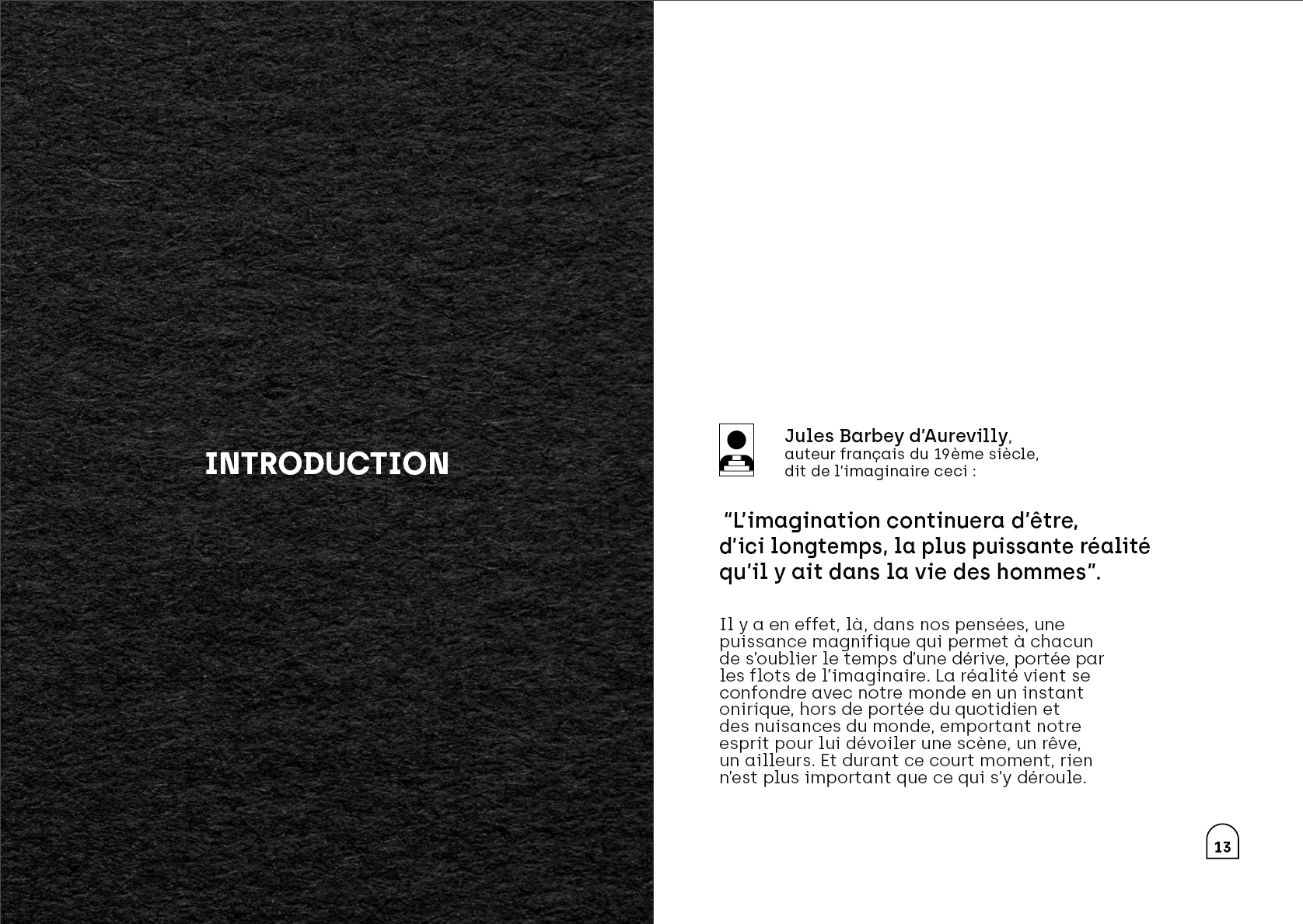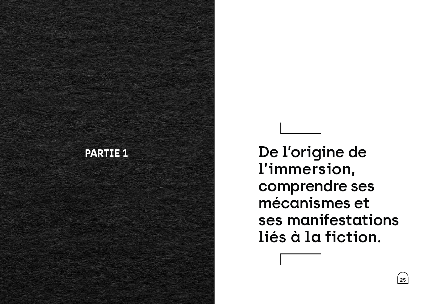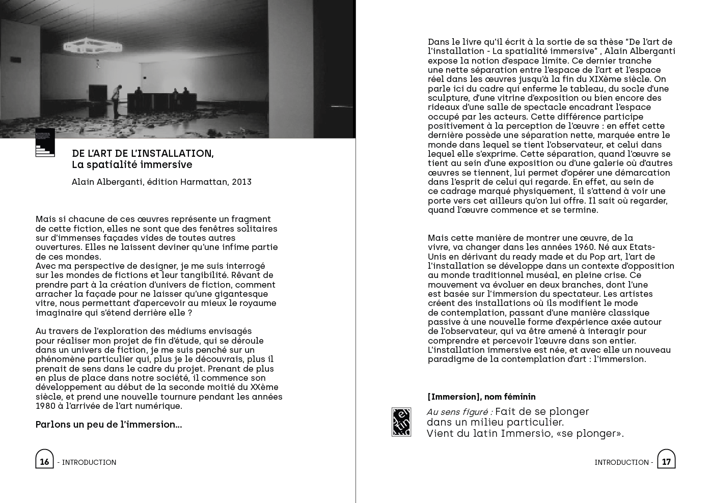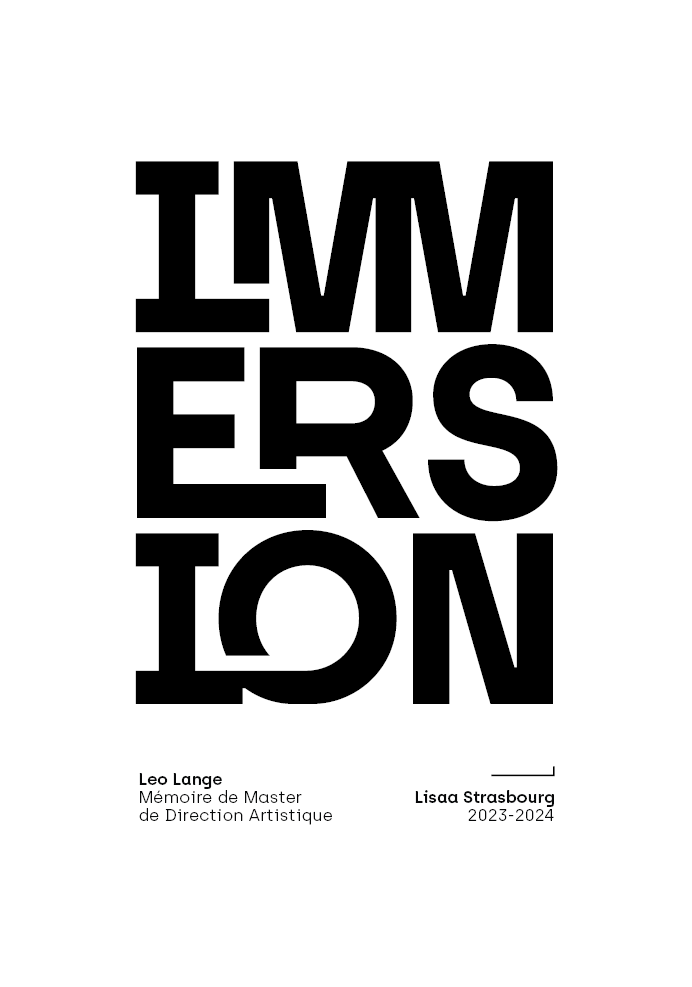Ce mémoire s'immisce dans le concept de l'immersion et explore les facteurs qui permettent son émergence dans l'esprit du spectateur. Aboutissement graphique de mes études de design, ce mémoire produit en micro-édition apporte une mise en page épurée et un univers graphique propre.