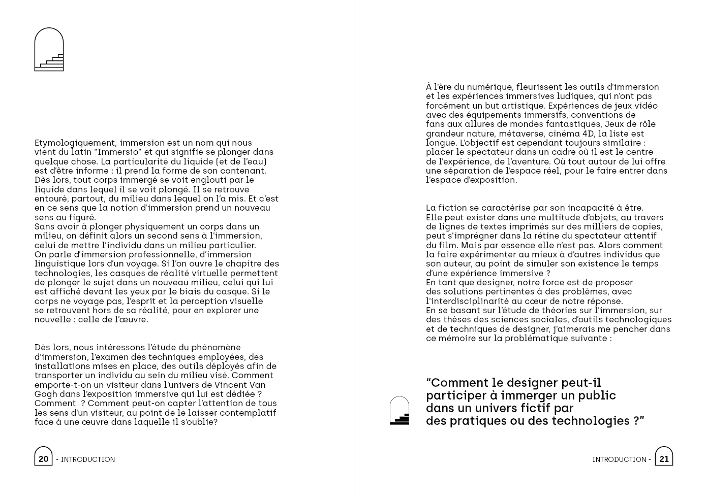 Entre design, marque page, pictogrammes originaux et les choix d'édition, le mémoire possède une esthétique singulière, servant autant à souligner son propos qu'à le mettre en valeur.